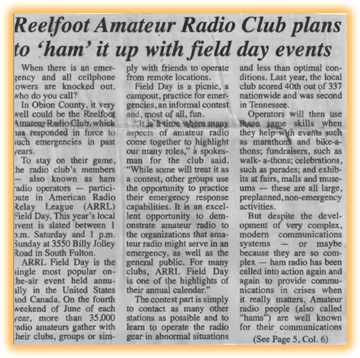 The Amateur Radio Relay League has had, as its largest and most popular operating event, Field Day for nearly 100 years. At this time, "portable" operators lugged their radio gear on pack horses or mules soon after the close of World War I to field operating sites to operate in this new event. Luckily, in this century, the "state of the art" has appreciably become lighter and more efficient. The idea behind Field Day is to set up radios at field locations all over North and South America in less than optimal conditions in order to showcase their capabilities and to have a LOT of fun ! "Lighter and efficient" were the target words for this year's event as the Reelfoot Amateur Radio Club tried some new and different things, as you will see. Amateur communications start on Saturday at 1 PM and cease at 1 PM on Sunday for a 24 hour total operation period.