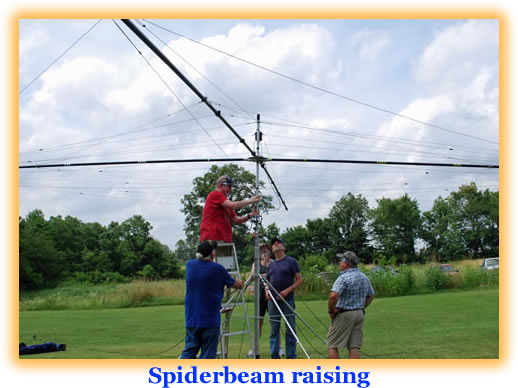 Only these two antennas were needed, as well as the Wild Card wire antenna, for the HF station setup. It was at this point that ol' Murphy along with Mother Nature came to pay us a visit !! The weather reports appeared to show the usual "popcorn" storms that we have been getting almost daily. But this time it brought some pronounced and severe winds in excess of 60 miles per hour !! The first thing that happened was one of the guy lines to the aluminum mast loosened causing the mast to tilt over nearly 40 degrees. The significant wind load of the Spiderbeam and its present unusual attitude caused it to "helicopter" on the mast. Well, it was "all hands on deck" at this time as we all sprang to the guy lines and pulled the mast vertical. Everything was pitching wildly around us and the trees on the line all looked like they were buckling flat to the ground with the huge straight-line winds. The vertical antenna also lost one of its guy lines and was whipping wildly like there was a big fish on the other end ! One of the tubes of the aluminum mast slid down suddenly startling all of us as the mast became 4 feet shorter, but we all pulled the guys and held the antenna mast vertical until the winds died down. That seemed like forever but very luckily, it did not carry a lot of rain and no lightning !! We were able to secure the antennas and called it quits until the next morning when, we hoped, we would not encounter such weather again.