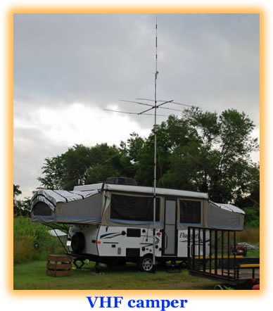 Noel KJ4UNX had setup his camper prior to this and the wind storm did not cause any damage to it. We waited until the next day to position the VHF antennas and set up the VHF station inside. The next morning the "junkyard dog" 6M yagi and the Cushcraft AR-270 were mounted on a new lightweight fiberglass mast with locks on each section. Guy rings were positioned and roped off to make it easy to turn the mast "Armstrong" style.