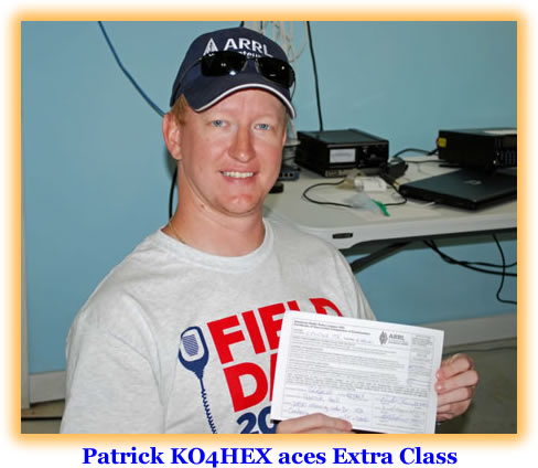 Congratulations to Patrick Hall, KO4HEX, for passing his Extra test at the VE session on Saturday morning with a score of 96%, missed only two questions.