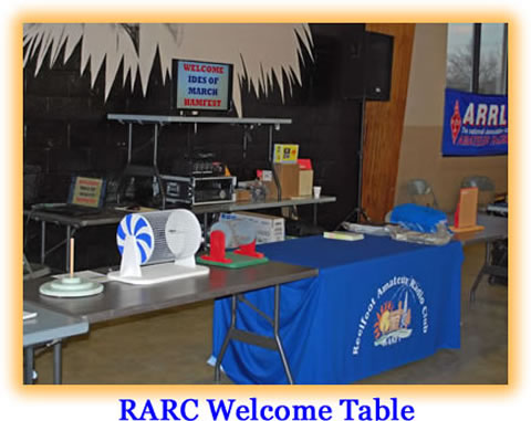 On Friday afternoon prior to the event, members of the Reelfoot Amateur Radio Club gathered at the Tennessee National Guard Armory to set things up. Things went quite smoothly thanks in part to good leadership with Glenn N4MJ and the Hamfest committee. We addressed the things most often commented on, such as the sound system quality and the lack of sitting space at the concession area. After doing some investigating as to what would be best and cost-friendly to improve the sound system, RARC club member Nathan KM4ZYM came up with an idea. He had access to a sound system similar to what we already had. If we connected the two systems together and point four large speakers into the middle of the floor, it should make a nice improvement. This turned out to be quite an understatement ! The tables and chairs were arranged a bit differently to allow more space for sitting at the concession area, but still give plenty of space and table to our vendors and enough for the flea marketeers. Another addition was a nice table cover for the Reelfoot Amateur Radio Club welcome area.